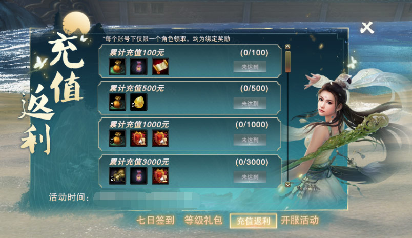 - 充值金额达到固定额度即可在游戏内领奖窗口领取对应奖励