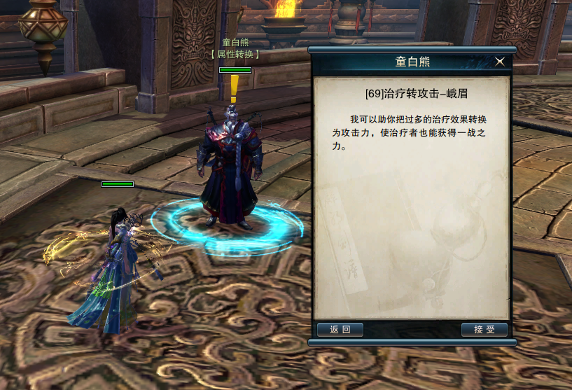 机制:进入副本后与专属NPC对话,即可将峨眉角色自身的治疗属性转化为内功攻击力。